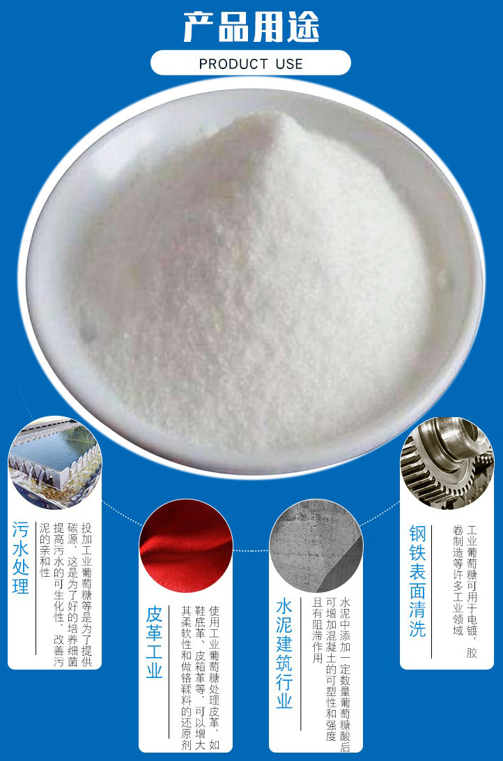 3、工業(yè)葡萄糖用做鋼鐵表面清洗劑:鋼鐵表面如需要鍍缽、鍍鉻、鍍錫、鍍鎳以適應(yīng)特殊用途時(shí),如制造馬口鐵,鍍鋅板,表面鍍鉻(電度)等,其鋼坯表面均需經(jīng)過嚴(yán)格清洗,使鍍層物與鋼鐵表面牢固結(jié)合,這時(shí)候其清洗藥劑中添加葡萄糖酸鈉將會(huì)達(dá)到十分理想的效果。工業(yè)葡萄糖可用于電鍍,膠卷制造等許多工業(yè)領(lǐng)域。